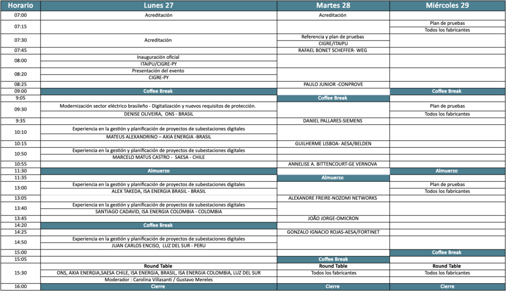 El local del evento estará disponible para los fabricantes una semana antes, a efectos de realizar la configuración y ensayos de las soluciones que serán presentadas. Este evento será en la modalidad Hibrida presencial en ITAIPU ROGA o virtual se prevé la participación de más de 300 participantes de toda Iberoamérica con participación de los comités de estudio del CIGRE D2 y B5.
